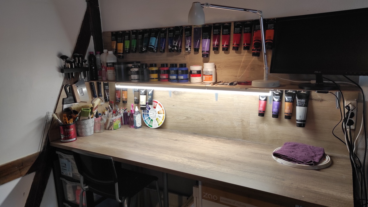 Animé par cette nouvelle passion, j’ai installé un atelier dans une partie de mon salon. Cet espace est devenu mon sanctuaire créatif, où je mets en pratique mes idées et où je m’efforce de créer des œuvres uniques. J’ai tout d’abord commencé mes expérimentations de peinture sur du papier, puis sur des cartons entoilés, pour enfin passer sur des châssis en bois entoilés. Mon inspiration vient de multiples sources : les objets du quotidien, des images évocatrices, et bien sûr, des couleurs qui se marient ou s’opposent dans un jeu visuel captivant. Tout ce qui m’entoure peut être une source d’idées, une étincelle qui nourrit ma créativité.